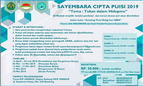 Kumpulan Cerpen, Puisi, dan Resensi Buku yang Keren dan Menarik: (DL 5 MEI 2019) Sayembara Cipta Puisi 2019 SEMA Penyelenggara FKIP Uninus dan HIMADIKSATRIA Uninus