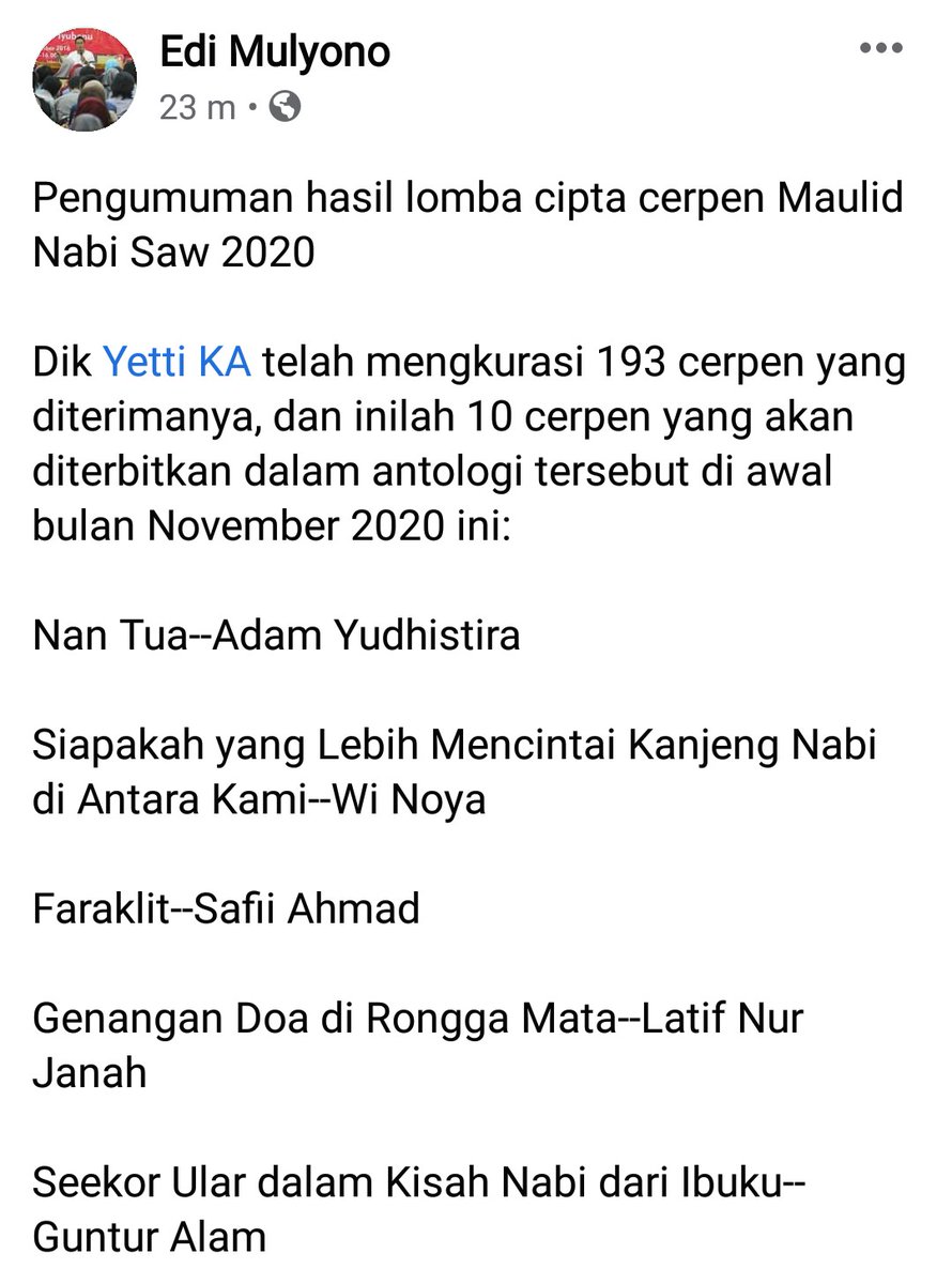 EDI AH IYUBENU on Twitter: “PENGUMUMAN Untuk event Maulid Nabi Saw tahun depan, keren sekali jika kubikin lomba cipta novel ttg Kanjeng Nabi Saw, ya… Siap-siap, Hyung….. @divapress01 @basabasi_store @Fiksi_DIVAPress… https://t.co/SqzLYQjt4U”