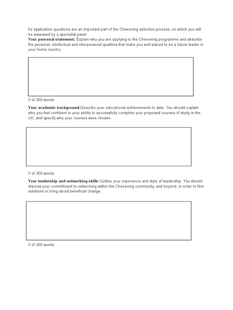 Chevening Essay Questions In this section you are asked to complete a series of short essay questions on the following areas: Le