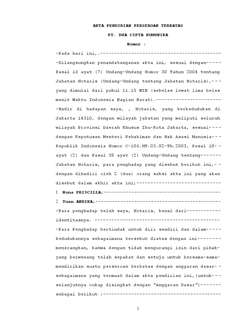 Contoh Akta Pendirian Perusahaan Terbatas
