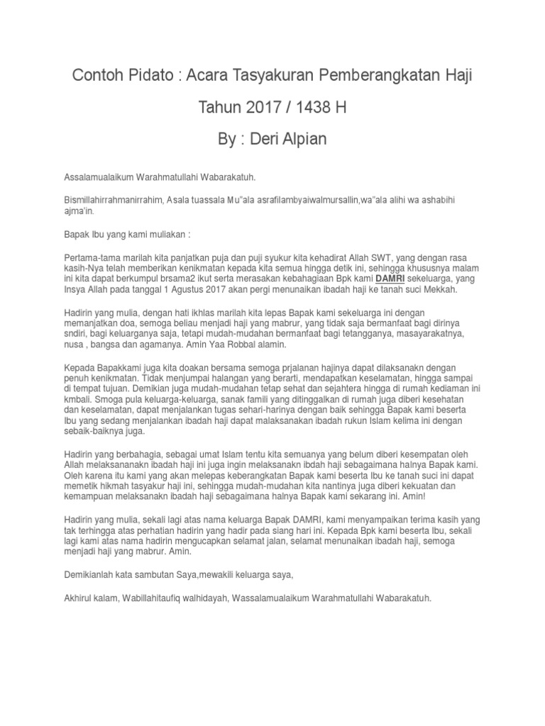 Contoh Pidato: Acara Tasyakuran Pemberangkatan Haji Tahun 2017 / 1438 H By: Deri Alpian