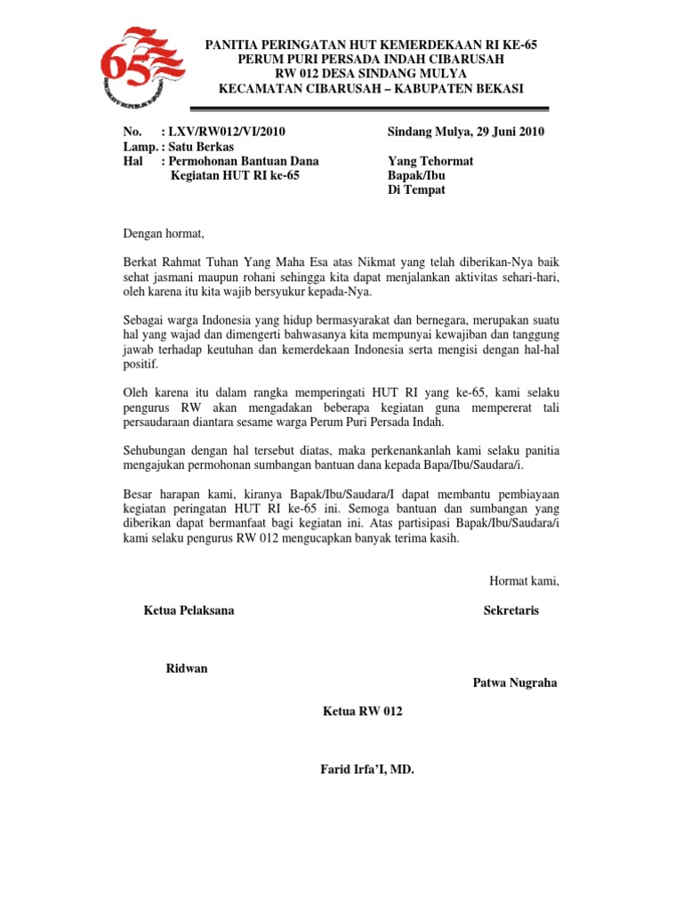 Contoh Surat Permohonan Bantuan Dana dan Proposal Kegiatan HUT RI
