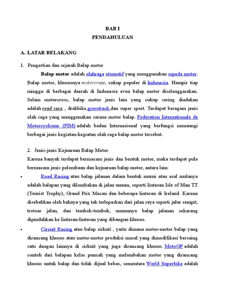 proposal road race.docx - BAB I PENDAHULUAN A LATAR BELAKANG 1 Pengertian dan sejarah Balap motor Balap motor adalah olahraga otomotif yang menggunakan | Course Hero