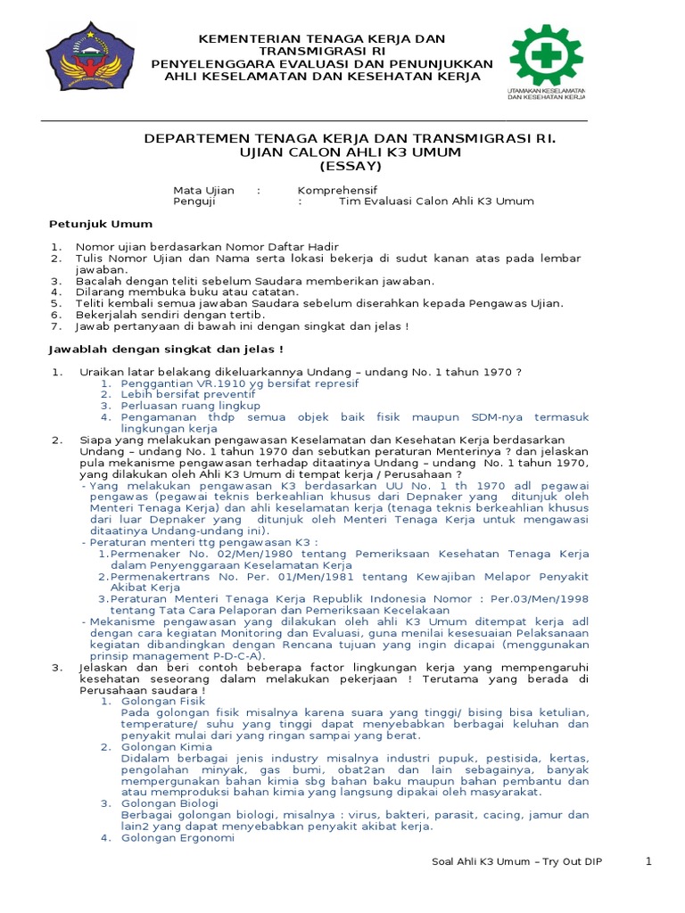 Soal dan Jawaban Ujian Ahli Kesehatan dan Keselamatan Kerja (K3) Umum bagian Essay – Ramka Education
