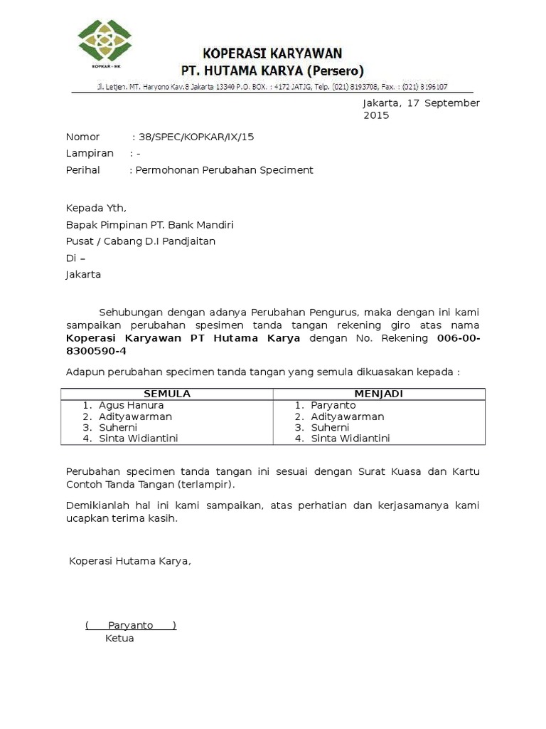 Contoh Surat Perubahan Specimen Tanda Tangan Bank - Bagikan Contoh