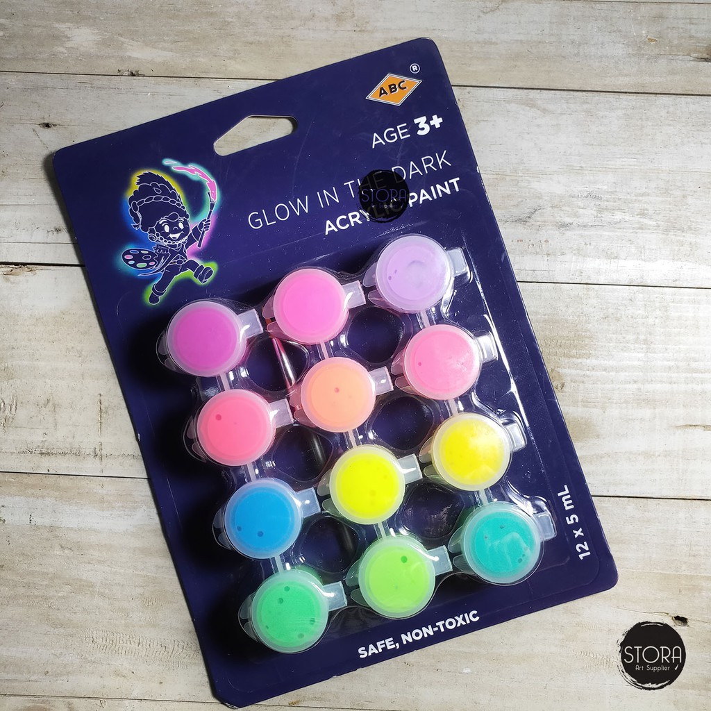ABC Glow in the Dark Acrylic Paint 12x5ml / Cat Akrilik Lukis Kain Glowing Menyala Terang Cat Anak | Shopee Indonesia
