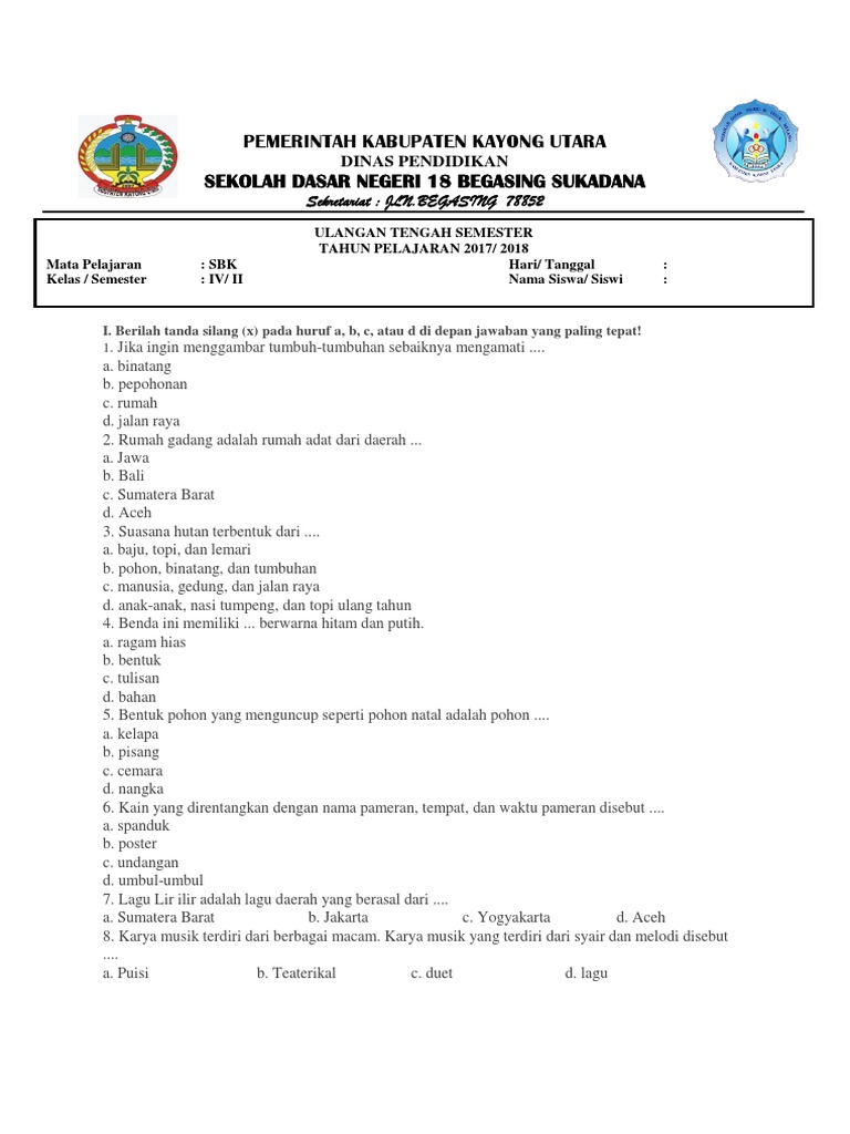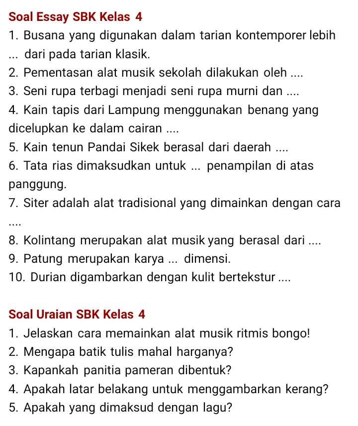 Soal SBK Kelas 4 SD K13 Pilihan Ganda, Uraian, dan Essay - DWI PURWANTO