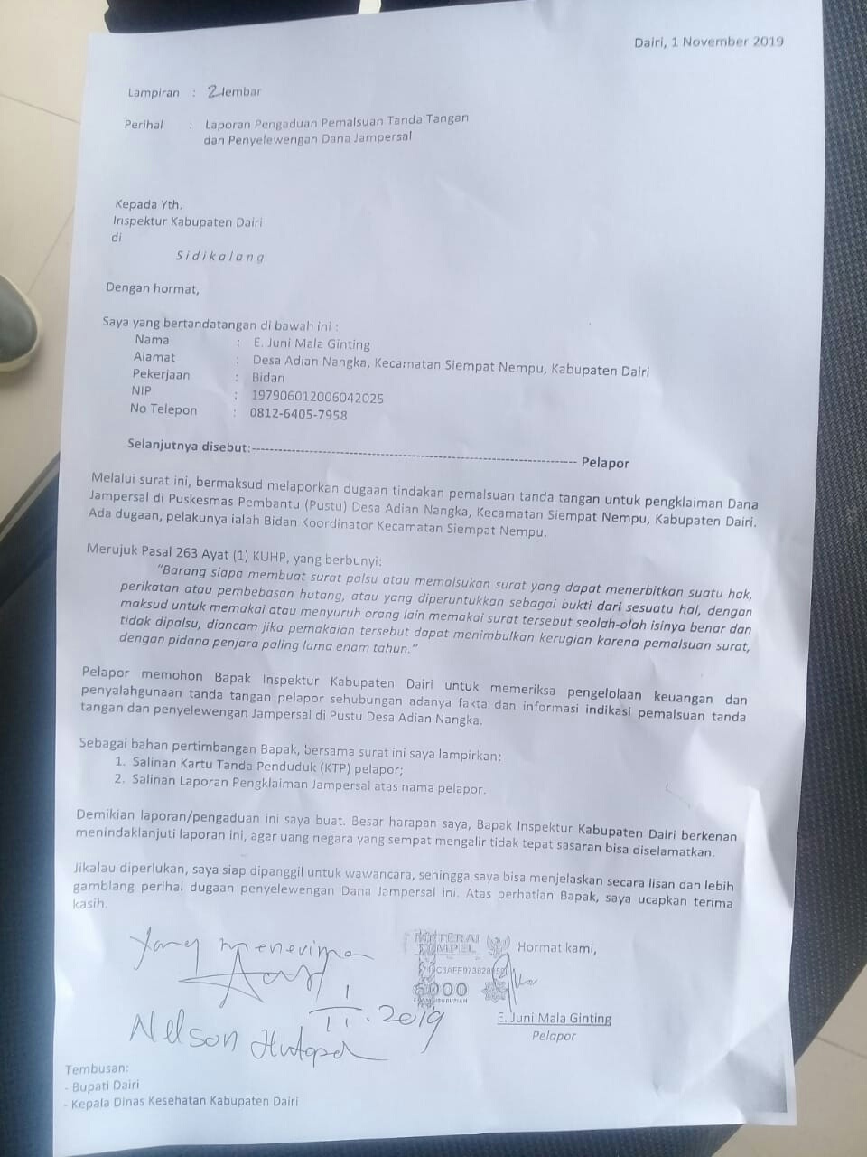 Dugaan Pemalsuan Tanda Tangan, Bidan Pustu Desa Adian Nangka Laporkan Bikor UPT Puskesmas Bunturaja ke Inspektorat | Metrokampung.com