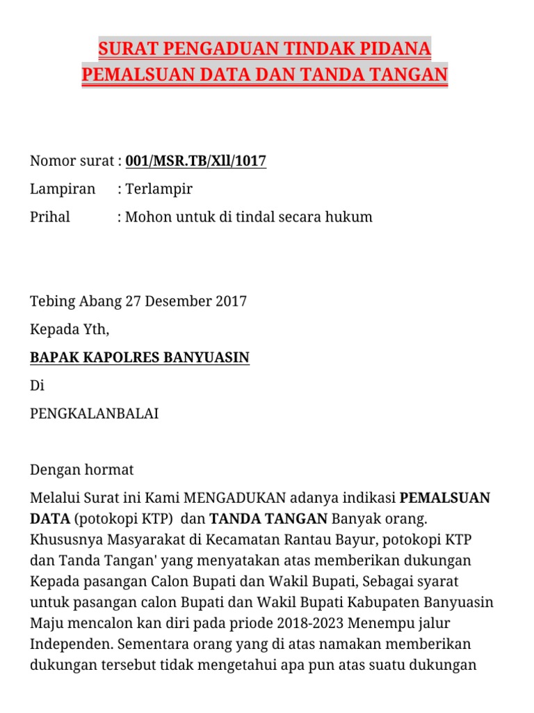 Surat Pengaduan Pemalsuan(1)-5Surat pemalsuan tanda tangan terkait dukungan pasangan calon bupati dan wakil bupati menemu jalur independen