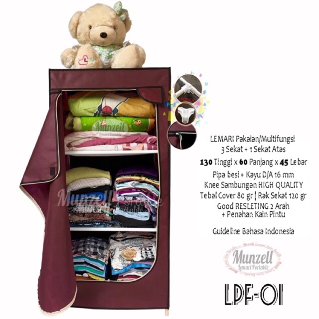 Lemari Pakaian Munzell LPF-01 MAROON | Lemari Baju / Lemari Anak 3 Susun + 1 Sekat Atas | Shopee Indonesia