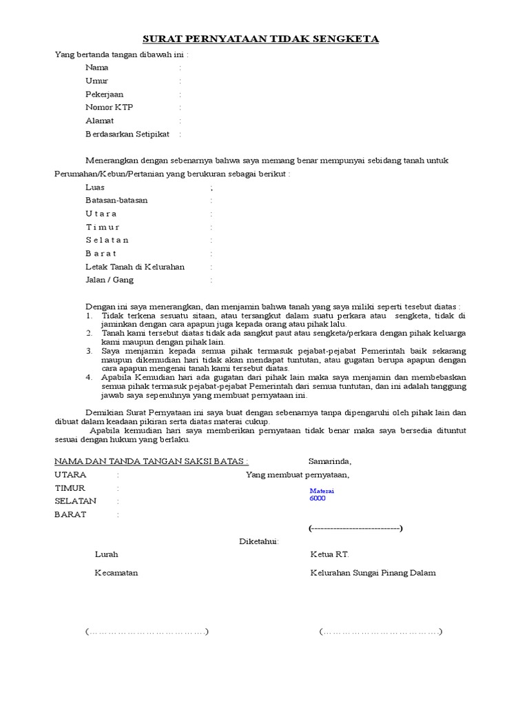 Surat Pernyataan Tidak Sengketa