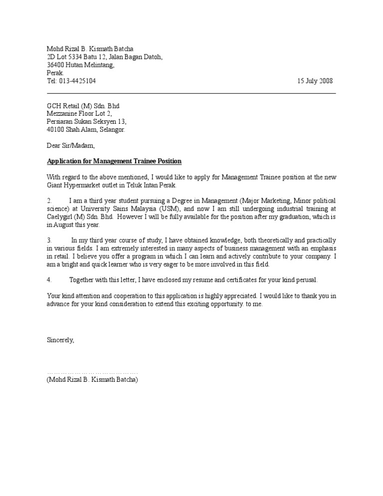 Cover Letter Graduate Management Trainee - Management Trainee Cover Letter