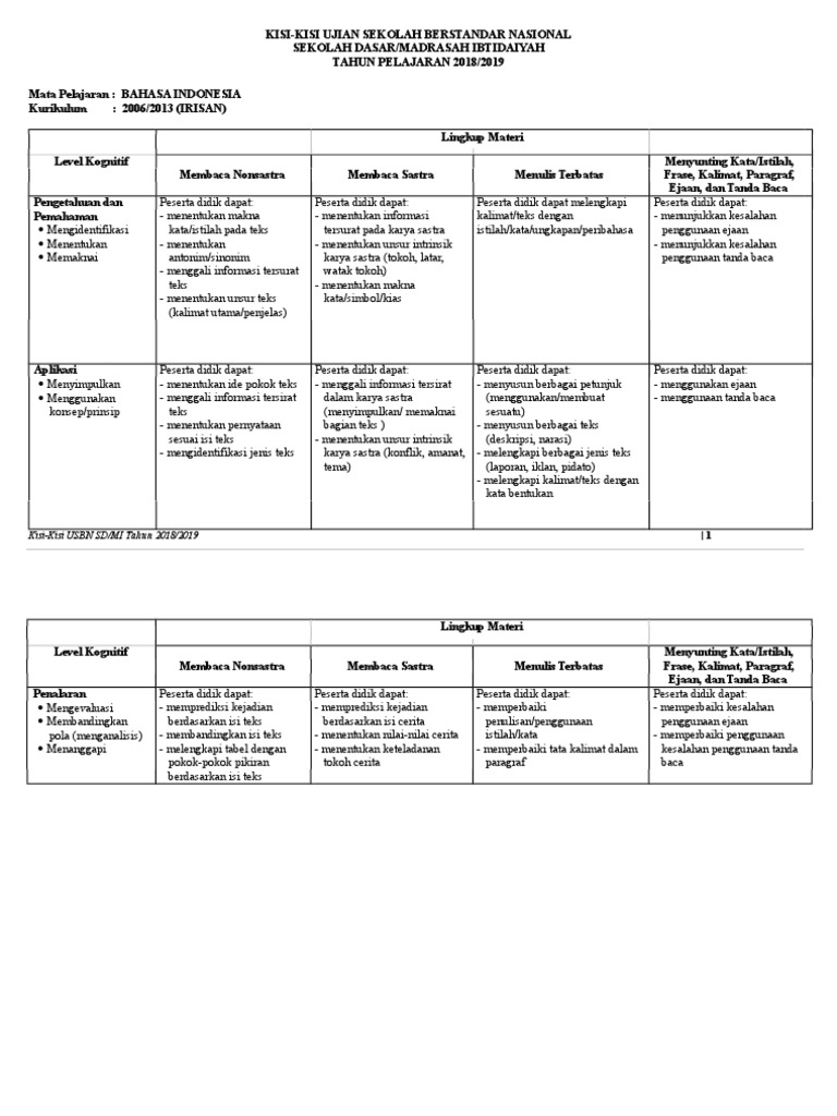 KISI-KISI USBN-SD-Bahasa Indonesia-Kur2006-2013 (Irisan) 2019 sahira.docx - KISI-KISI UJIAN SEKOLAH BERSTANDAR NASIONAL SEKOLAH DASAR/MADRASAH | Course Hero