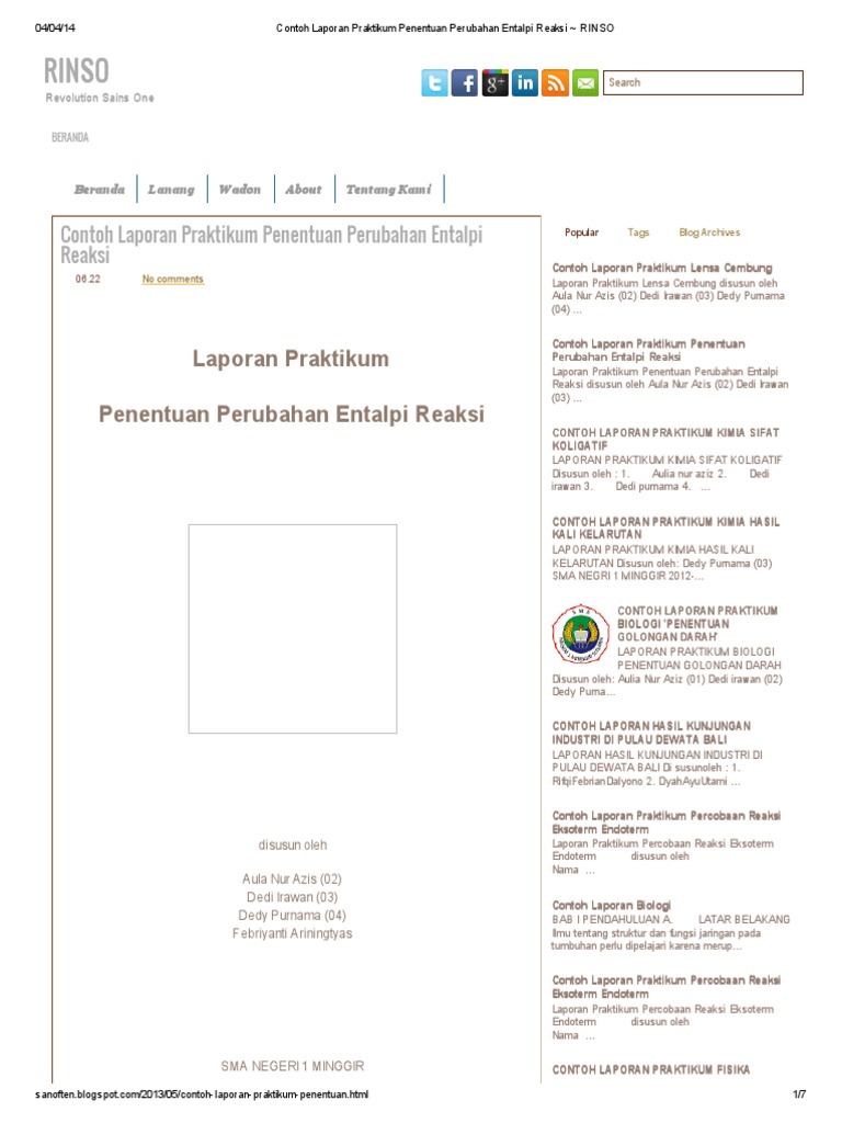 Contoh Laporan Praktikum Penentuan Perubahan Entalpi Reaksi ~ RINSO