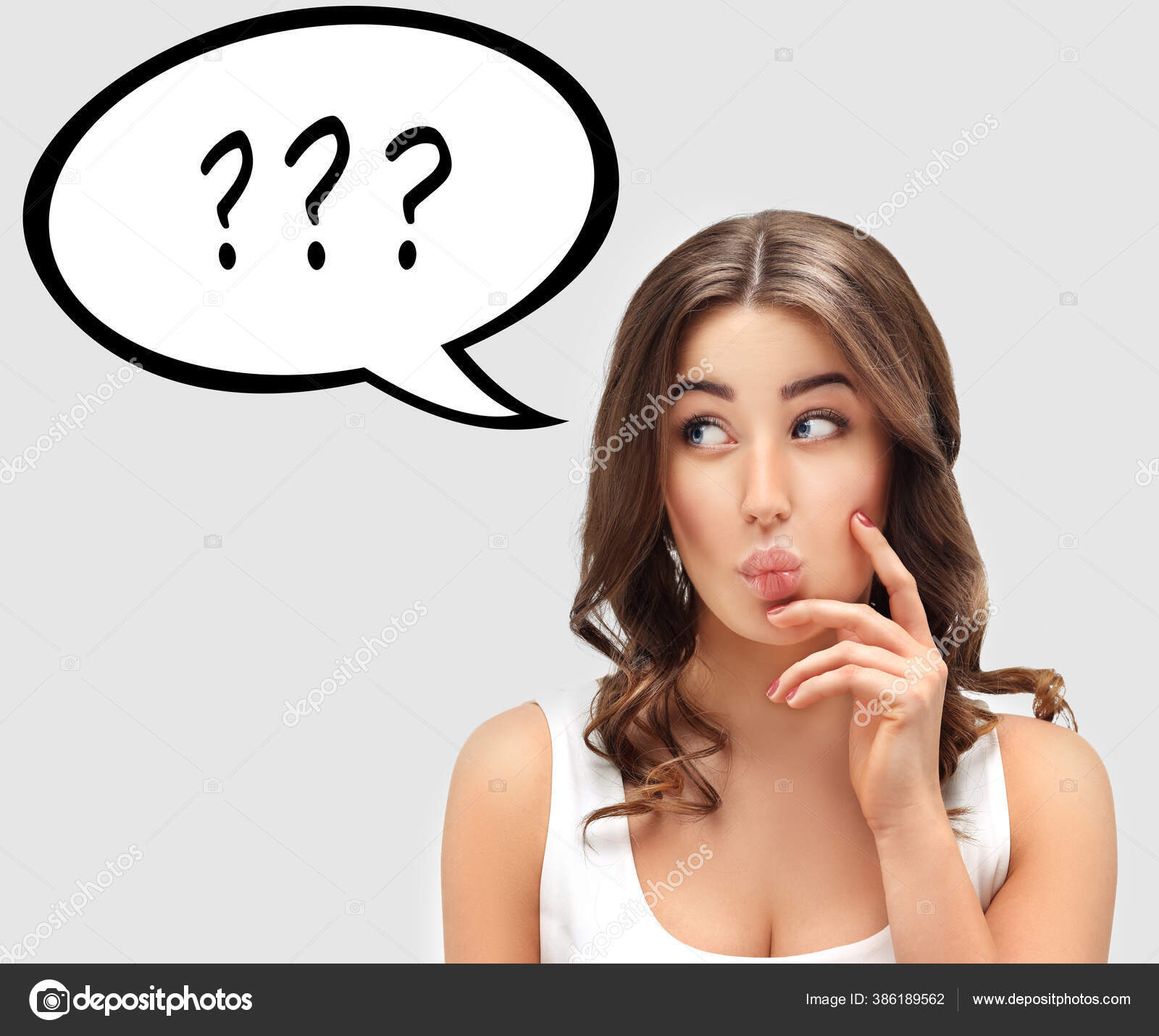 Wanita Muda Memegang Gelembung Pidato Dengan Gambar Tanda Tanya — Stok Foto © Lado2020 #386189562
