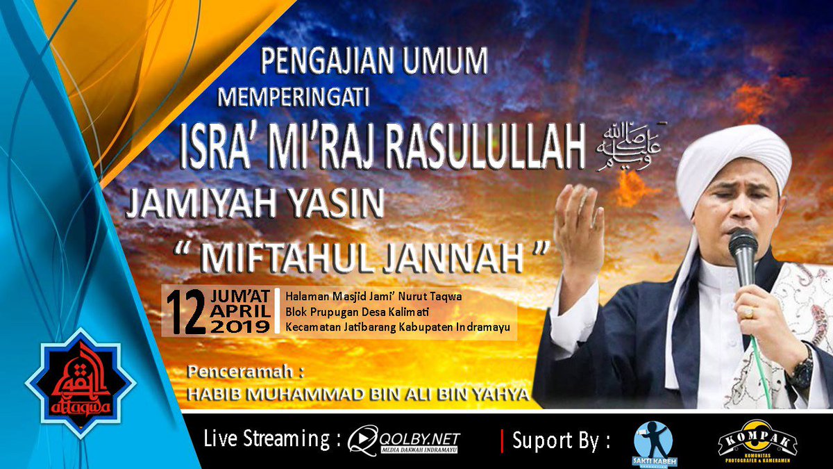 Twitter Info Jatibarang: “Pengajian Umum peringatan Isra' Mi’raj Rasulullah SAW di Desa Kalimati, Kec. Jatibarang. Jum’at, 12 April 2019 bersama Habib Muhammad bin Ali bin Yahya (Kang Ayip) dari Sindang. Live