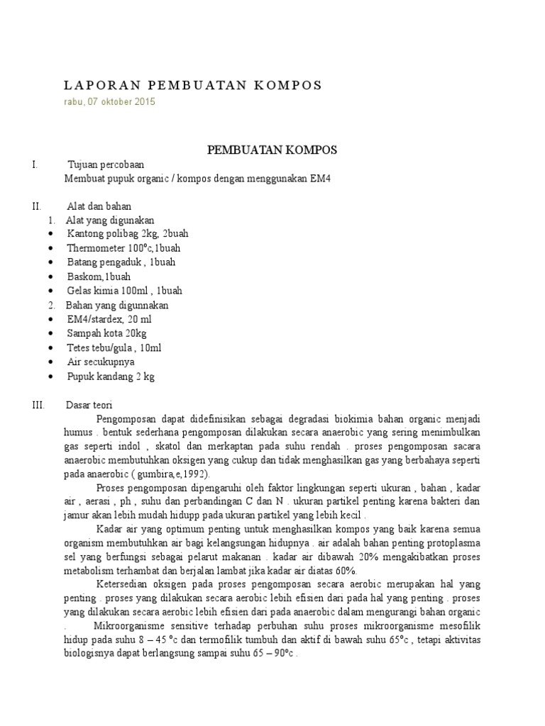 Laporan praktikum PEMBUATAN PUPUK KOMPOS ORGANIK MENGGUNAKAN BIOAKTIVATOR EM4 DAN AIR SAMPAH | Berbagi Ilmu