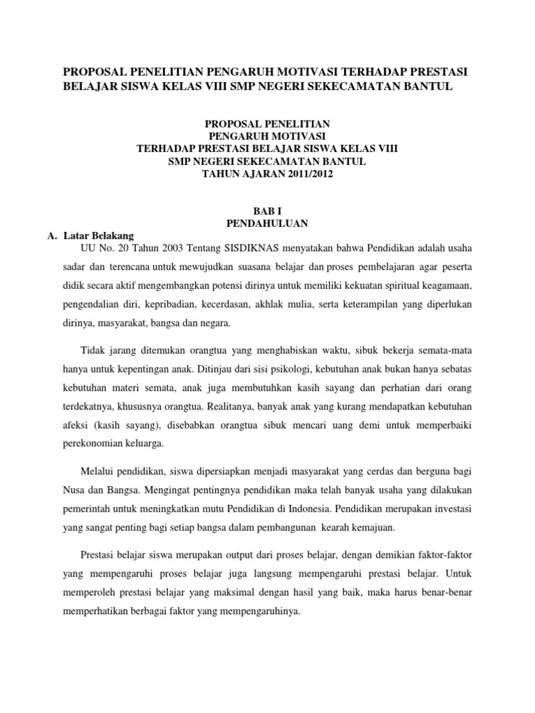 DOC) PROPOSAL PENELITIAN PENGARUH MOTIVASI TERHADAP PRESTASI BELAJAR SISWA KELAS VIII SMP NEGERI SEKECAMATAN BANTUL | stevany atok - Academia.edu
