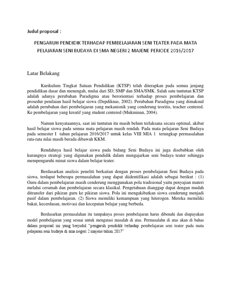 Judul proposal: Pengaruh Pendidik Terhadap Pembelajaran Seni Teater Pada Mata Pelajaran Seni Budaya Di Sma Negeri 2 Majene Periode 2016/2017