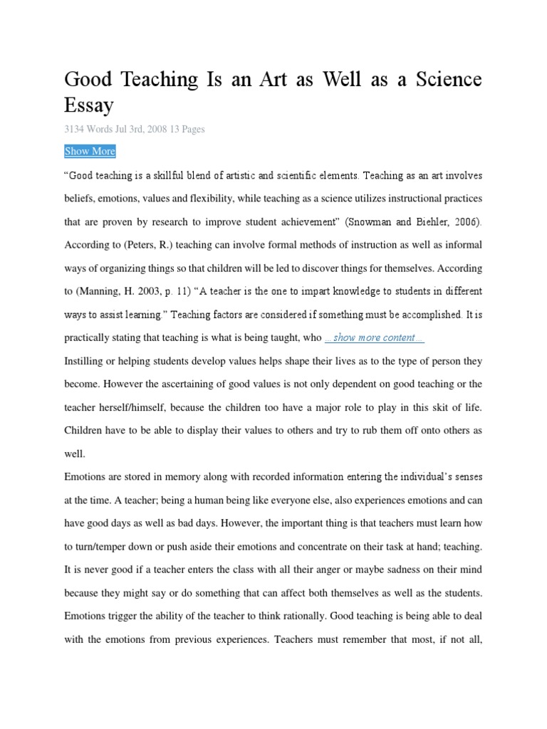 Good Teaching is an Art as Well as a Science Essay | Teachers | Social Sciences