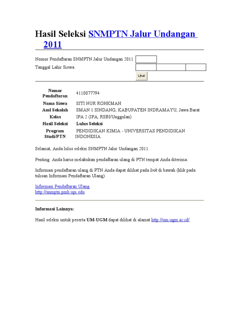 Hasil Seleksi SNMPTN Jalur Undangan 2011