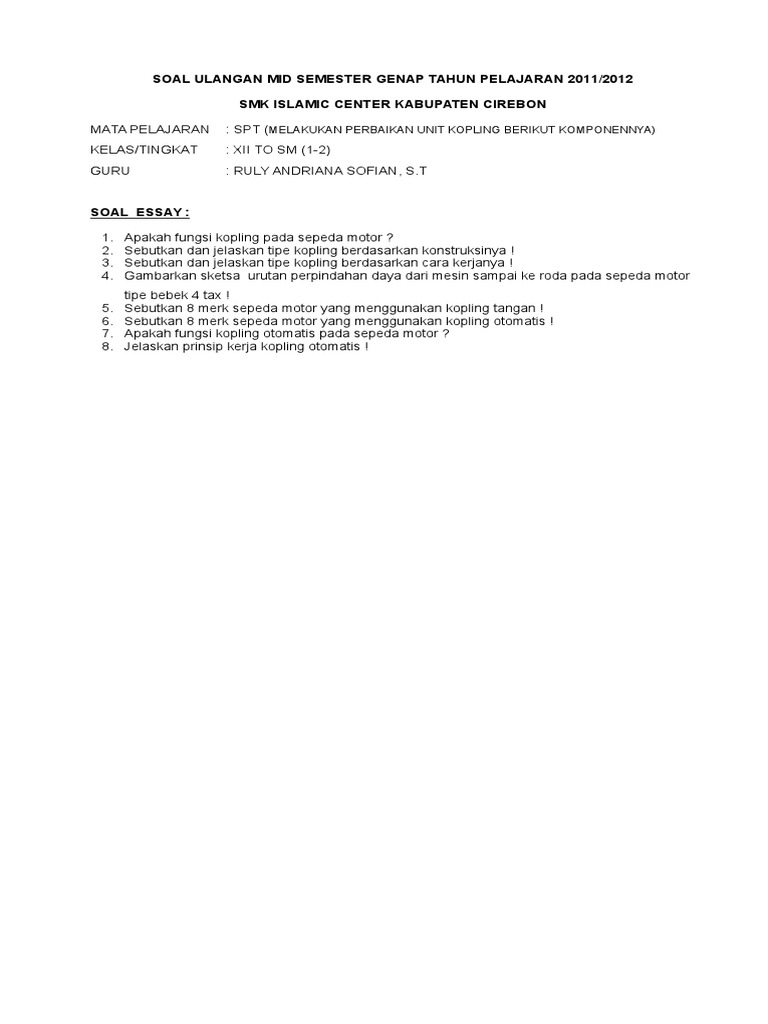 Soal Dan Jawaban Sistem Kopling Sepeda Motor