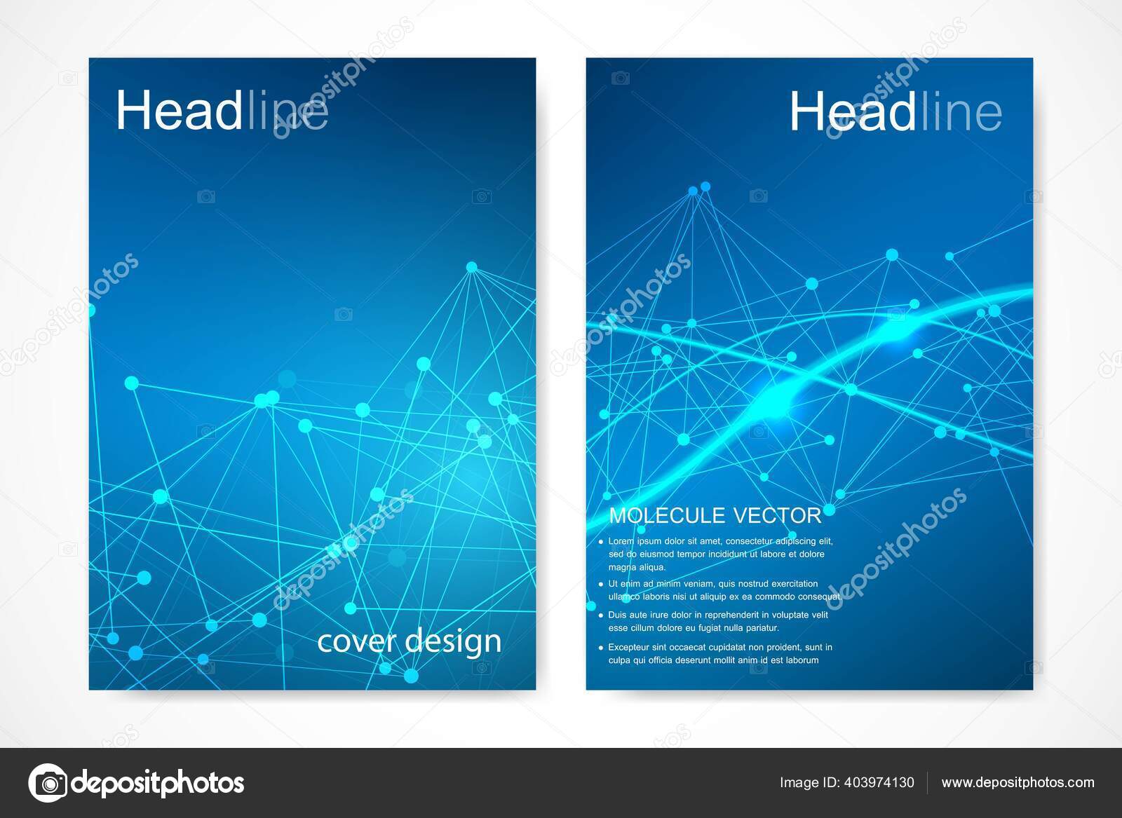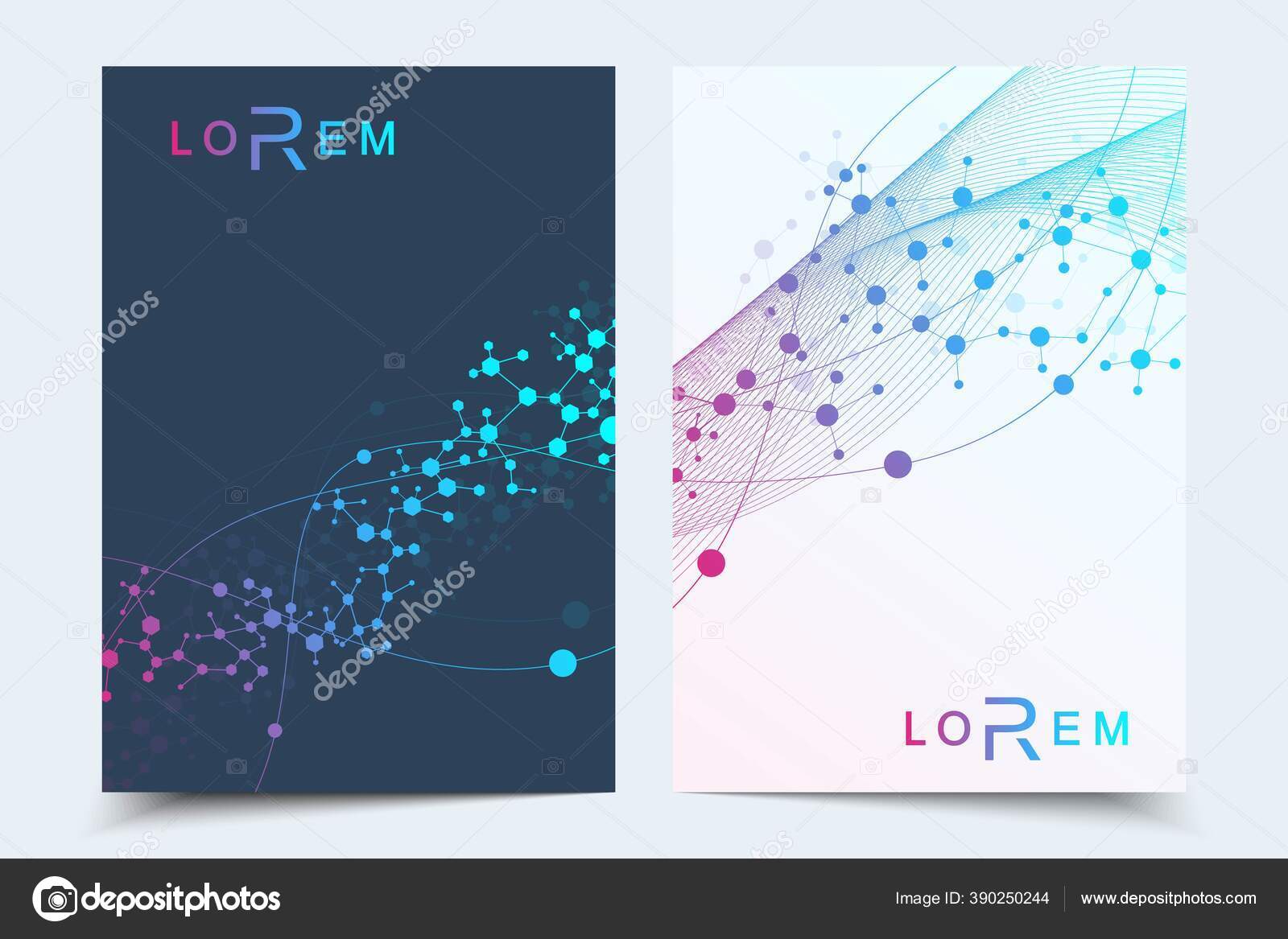 Set selebaran, ukuran brosur A4 template, banner. Struktur molekuler dengan garis dan titik yang terhubung. Pola ilmiah DNA atom dengan elemen untuk majalah, selebaran, penutup, desain poster. — Stok Vektor © Pro500 #380811388