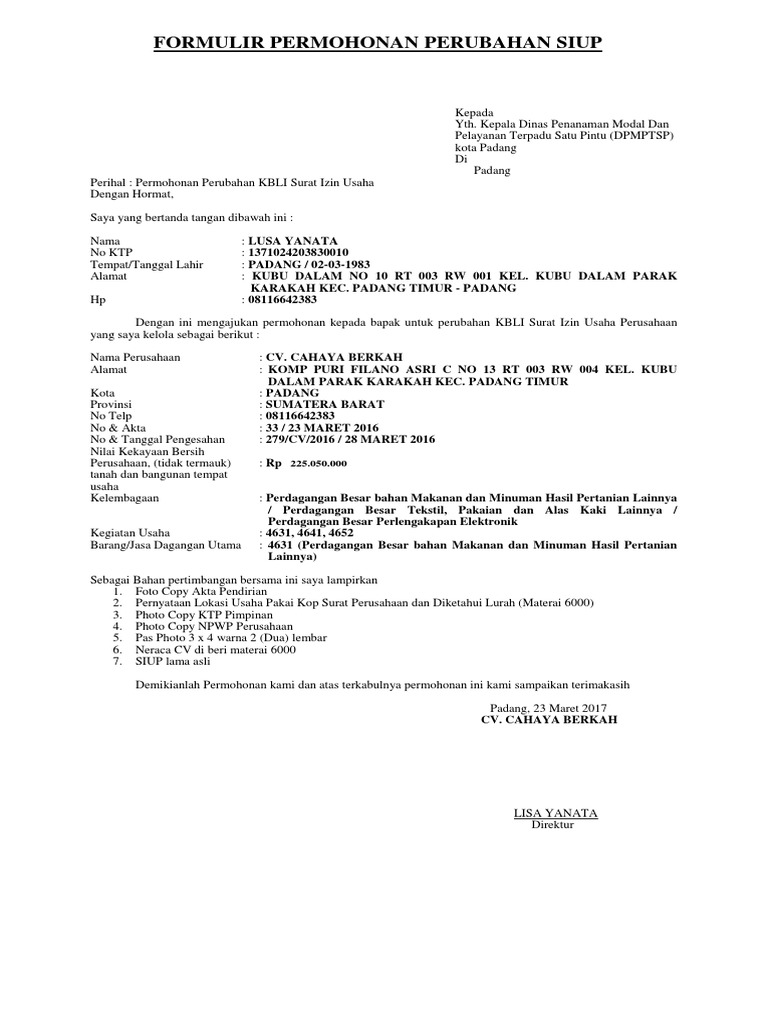 Surat Permohonan Perubahan Data Siup Dan Tdp