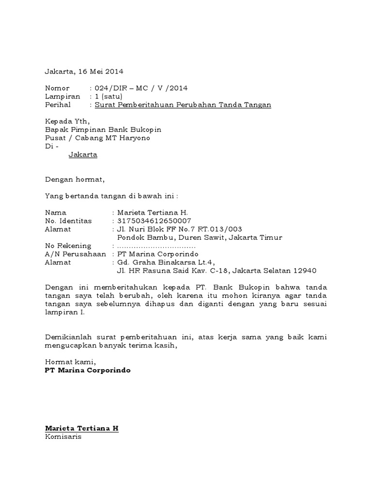 Contoh Surat Perubahan Specimen Tanda Tangan Bank - Bagikan Contoh
