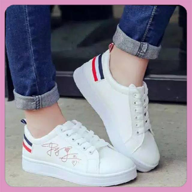 Sepatu Wanita Kets Sneaker Putih Tali Motif tanda tangan List merah Sporty Fashion Olahraga di Lapak KawaiAsia | Bukalapak