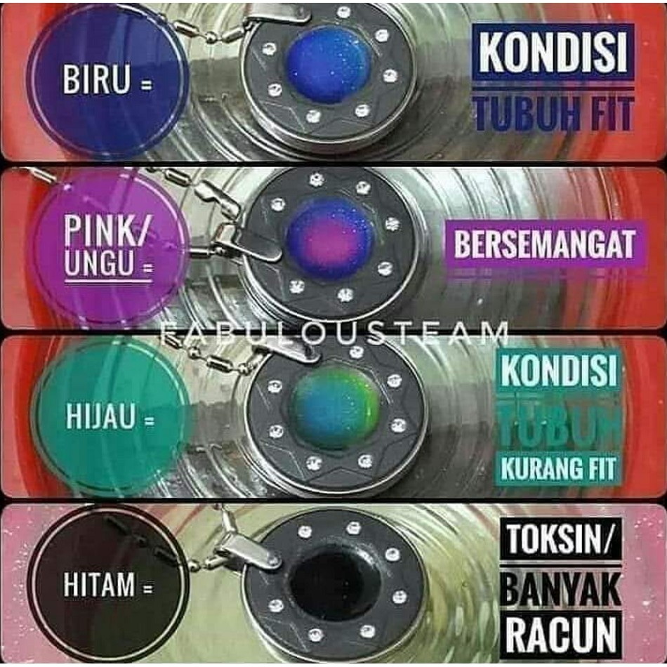 ARTI WARNA KALUNG PENDANT AURA YAITU: Biru = Kondisi tubuh sedang normal / Sehat Orange = Kondisi Dingin Hijau = Kondisi Tubuh Kurang fit/ Sakit Pink = Bergairah / Bahagia Hitam =