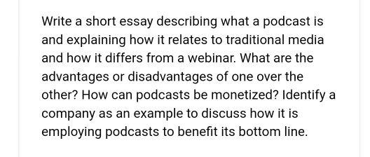Solved: Write A Short Essay Describing What A Podcast Is A …