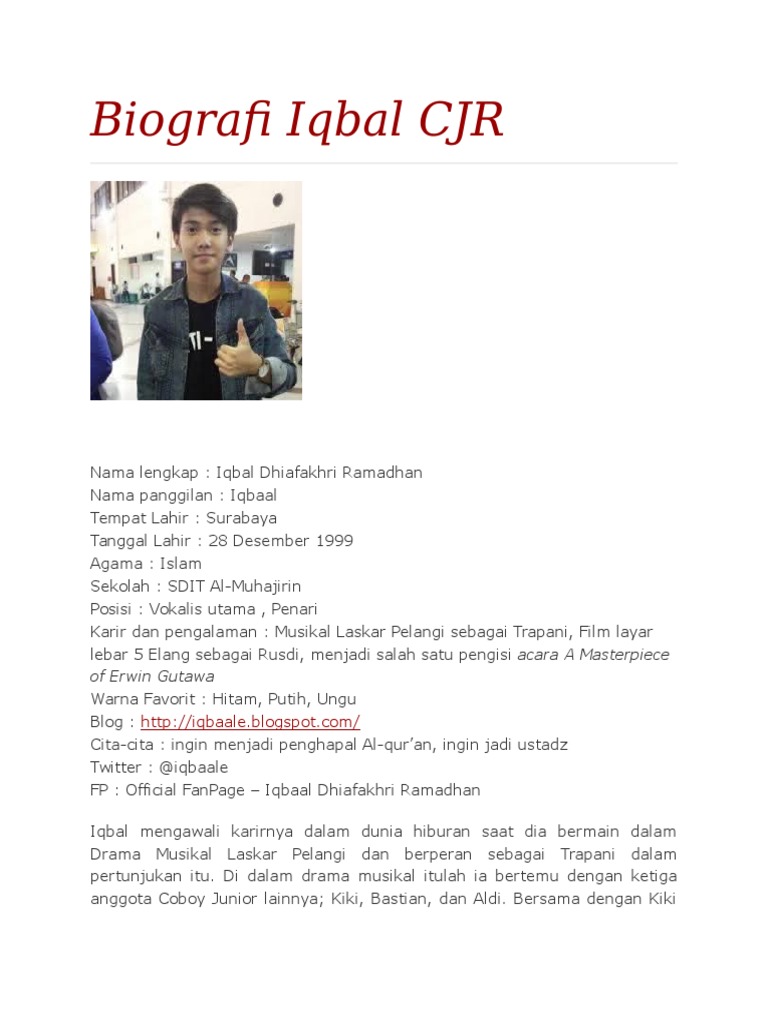 Buatlah biografi tentang Iqbaal CJR - Brainly.co.id