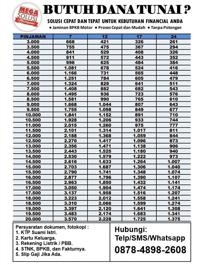 Terjual TABEL ANGSURAN KREDIT DANA TUNAI JAMINAN BPKB MOTOR DAN MOBIL. TERBARU | KASKUS