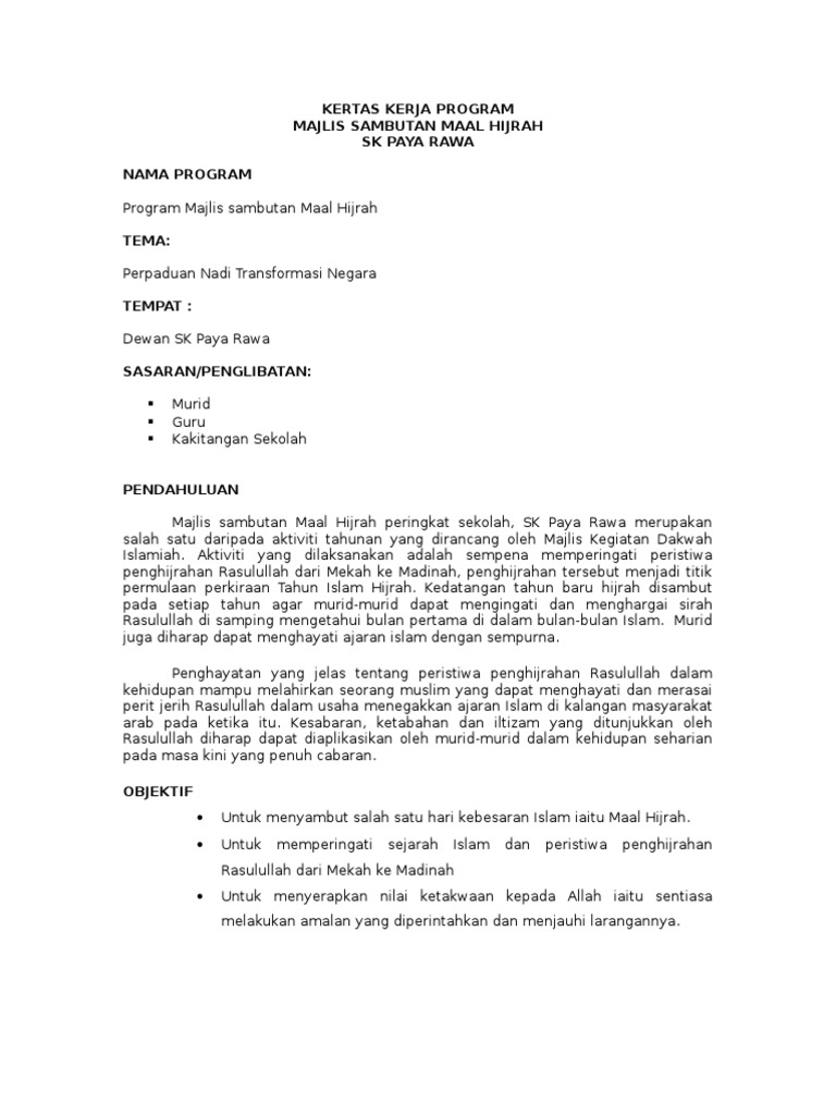 Kertas Kerja Program Majlis Sambutan Maal Hijrah Sk Paya Rawa Nama Program