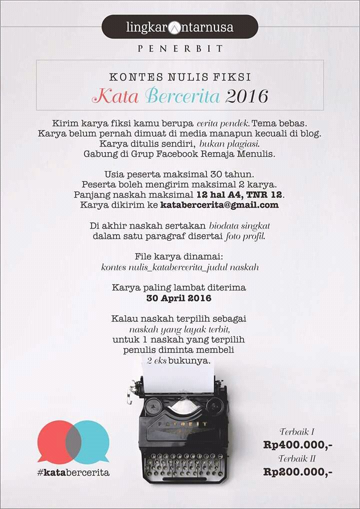 Remaja Berkarya on Twitter: “Dear @KontesID. Mau share #kontesnulis cerpen #katabercerita 2016 berhadiah total 600 rb rp. Deadline 30 april 2016 https://t.co/Jsu6tsir3T”
