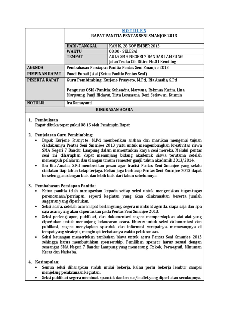 Contoh Notulen Rapat Panitia Pentas Seni SMA
