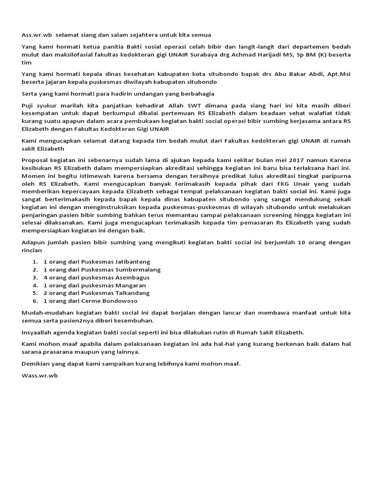 Sambutan Kegiatan Bakti Sosial Bibir Sumbing