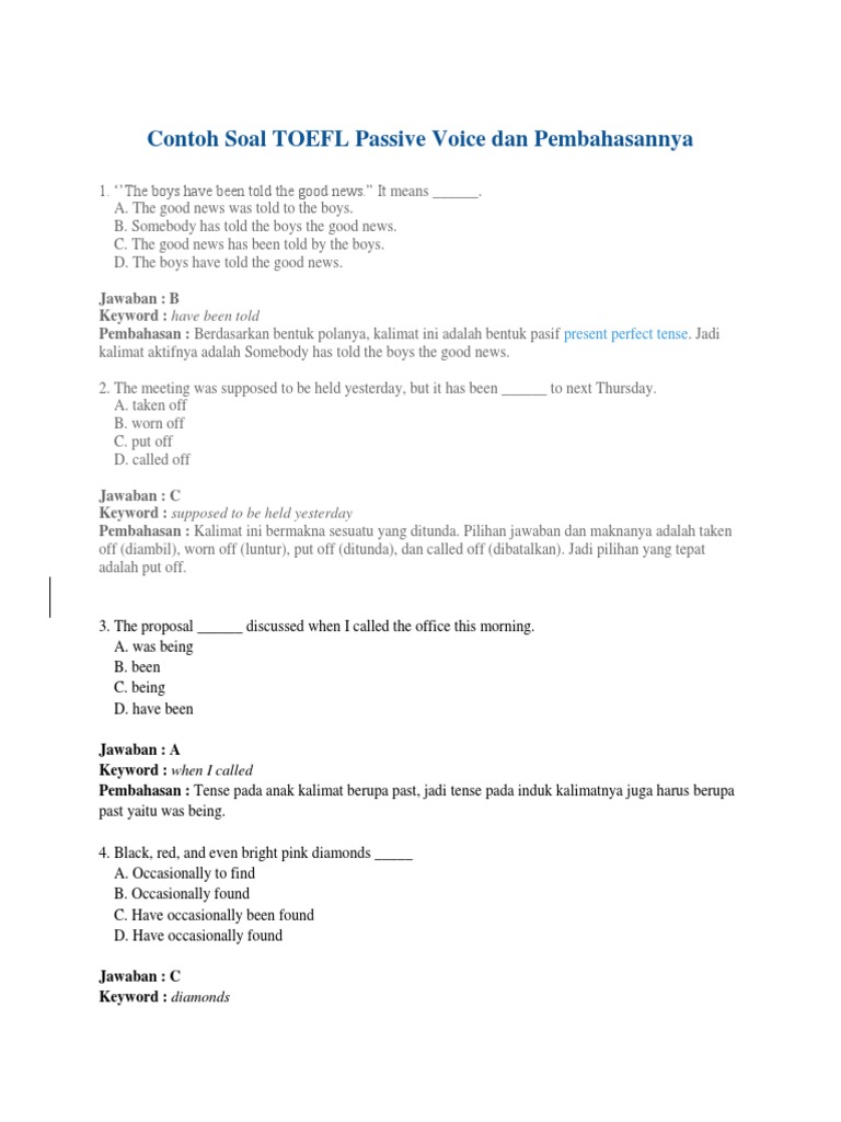 Contoh Soal TOEFL Passive Voice dan Pembahasannya