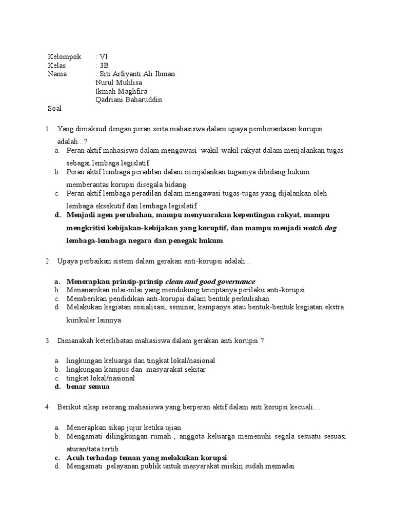 Soal Dan Jawaban Peran Mahasiswa Dalam Anti Korupsi Kelompok 6