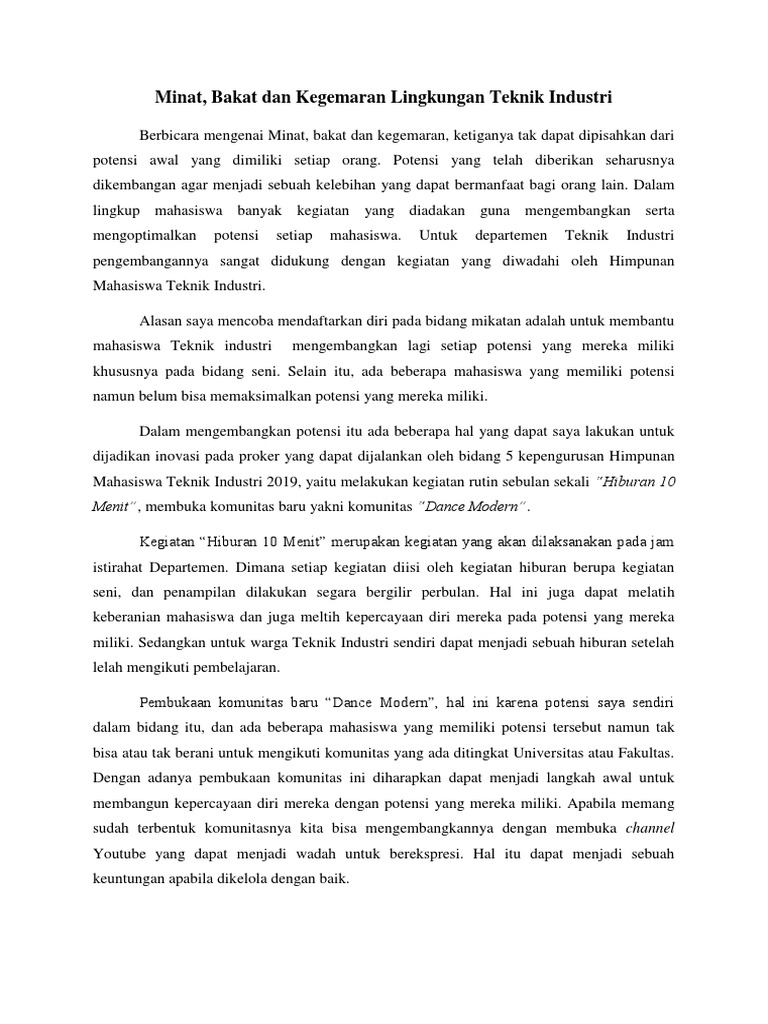 Essay Minat dan Bakat.docx - Essay Minat dan Bakat Tidak ada seorang pun yang tidak berbakat yang membedakan ialah ada tidaknya minat untuk | Course Hero