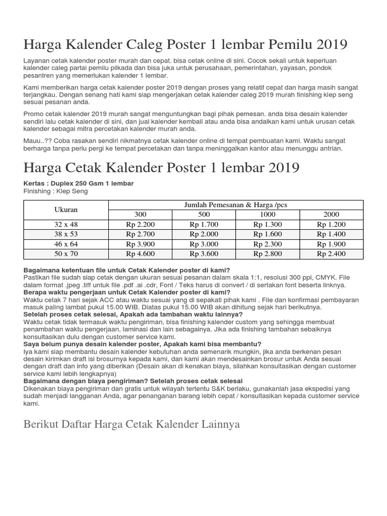Harga Cetak Kalender Poster 2019 Murah - Cetak Online