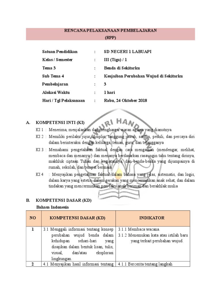 GURU BERBAGI | RPP Perubahan Wujud Benda Kelas 3 Tema 3