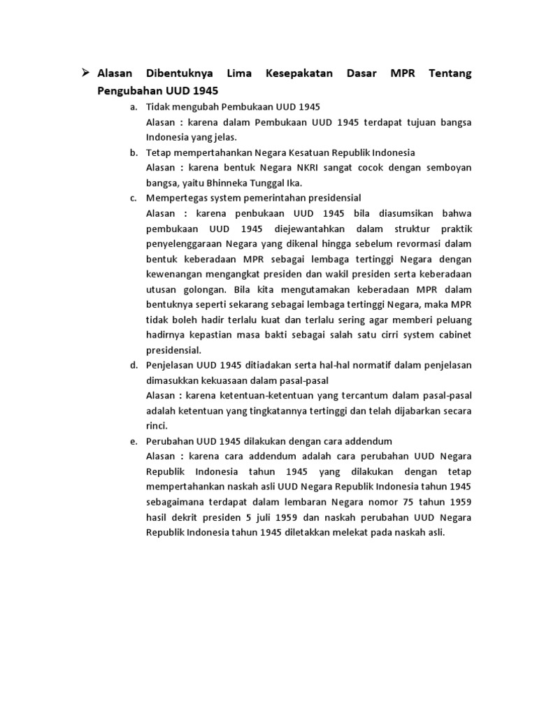 Alasan Dibentuknya Lima Kesepakatan Dasar MPR Tentang Pengubahan UUD 1945
