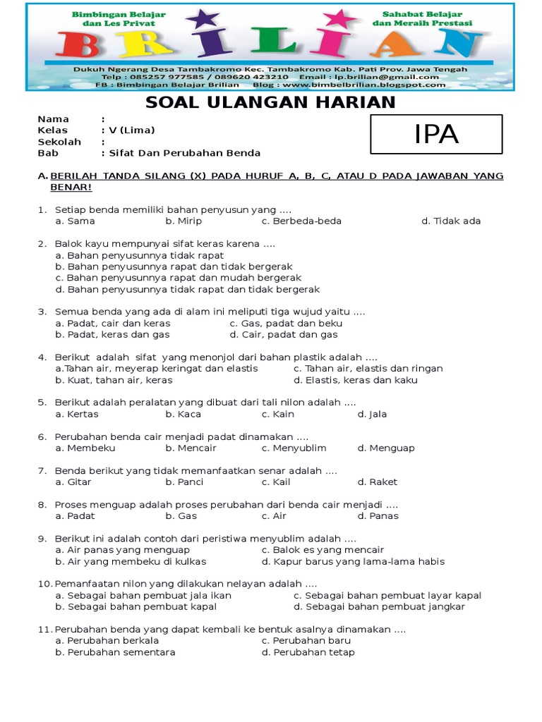 Soal IPA Kelas 5 SD BAB Sifat dan Perubahan Benda Dan Kunci …