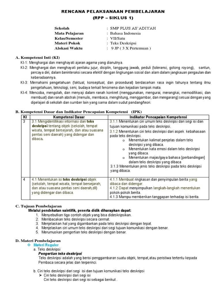 DOC) RPP BAHASA INDONESIA VII TEKS DESKRIPSI | Asisten Nur - Academia.edu