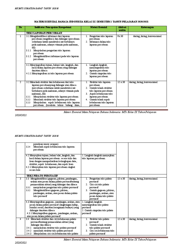 MATERI 9 K13.docx - TEKS KOMPETENSI DASAR DAN INDIKATOR SEMESTER SATU TEKS TEKS LAPORAN PERCOBAAN 3.1 4.1 3.2 4.2 TEKS PIDATO PERSUASIF 3.3 4.3 3.4 4.4 | Course Hero