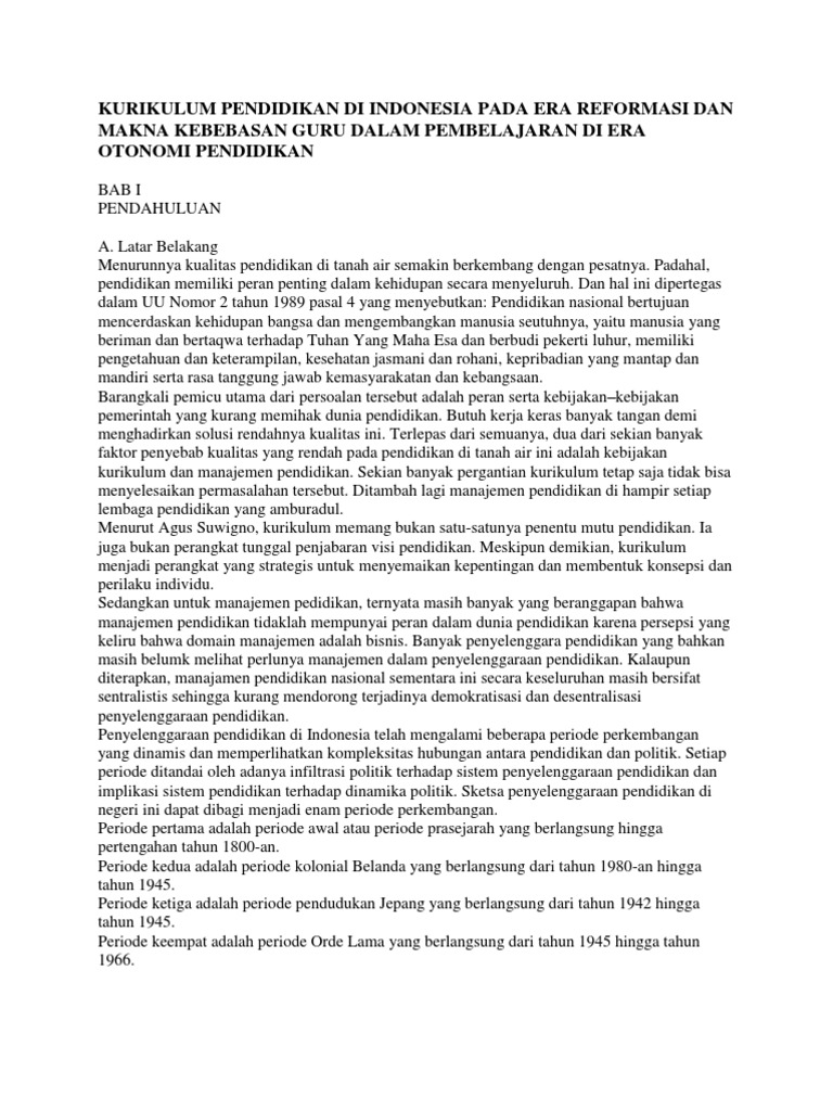 Kurikulum Pendidikan Di Indonesia Pada Era Reformasi Dan Makna Kebebasan Guru Dalam Pembelajaran Di Era Otonomi Pendidikan