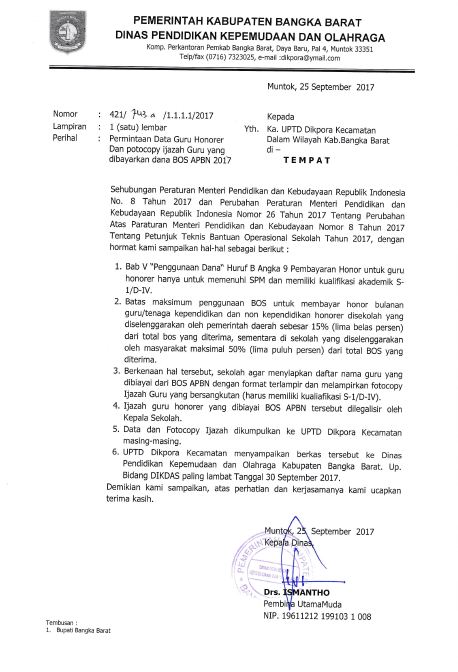DINAS PENDIDIKAN KEPEMUDAAN DAN OLAHRAGA: PERMINTAAN NAMA DAN POTOCOPY IJAZAH GURU HONOR YANG DI BAYARKAN OLEH DANA BOS APBN TAHUN 2017