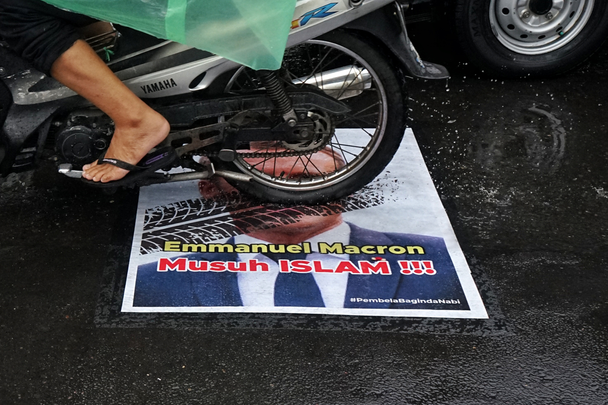 Menista Islam ! Ibu-ibu di Medan, Injak dan Robek Poster Presiden Prancis